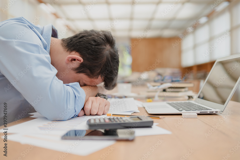 Handsome Businessman Sleepy Before Working With Laptop At Desk In Office Working Late Night And Start Working Early In The Morning Stock Photo Adobe Stock