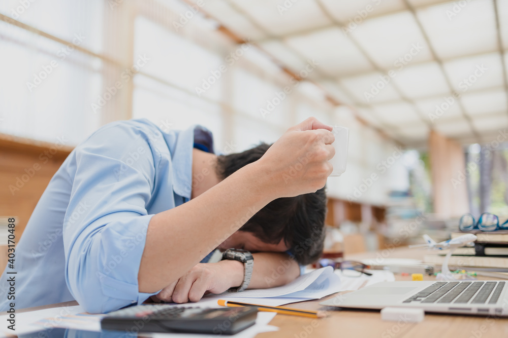 Handsome Businessman Sleepy With Coffee Before Working With Laptop At Desk In Office Working Late Night And Start Working Early In The Morning Stock Photo Adobe Stock